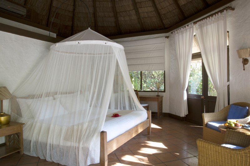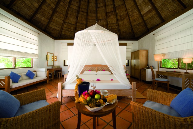 Les 32 Beach Villas sont orientées plage avec une petite terrasse privative sur jardin, salle de bain avec extension douche dans un patio à ciel ouvert, lit king size à moustiquaire.