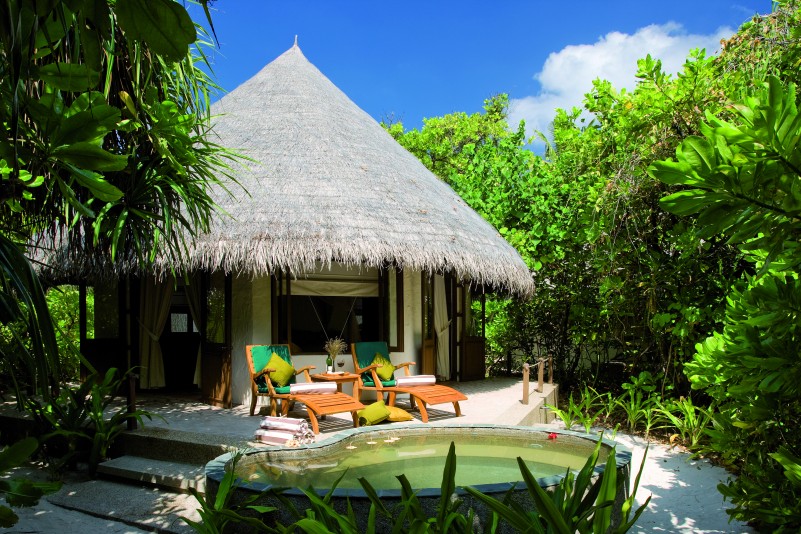 Palm Dhuni Kolhu. La terrasse extérieure est entourée d'une piscine privée qui fait face à la plage.